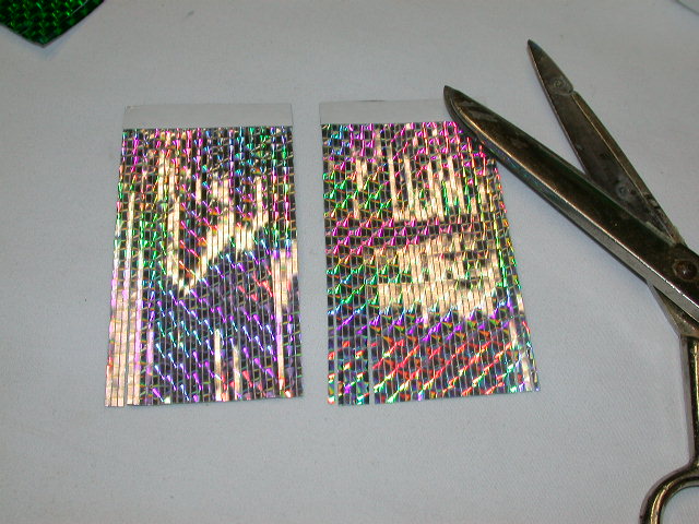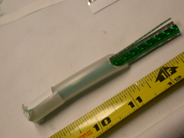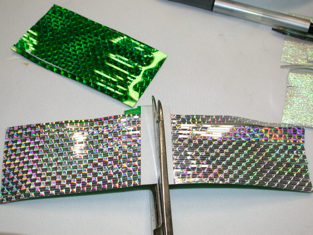 Dividing the Mylar that already has the double faced adhesive. 2. Two pieces of fringe tape, soon to be four, you'll need to peel off this backing. 3 . Enough material to do 4 attractor flies 4. Circumference of bullet is 3/4, DO NOT precut the Mylar fringe to this size. |