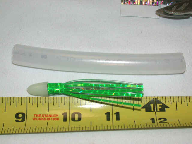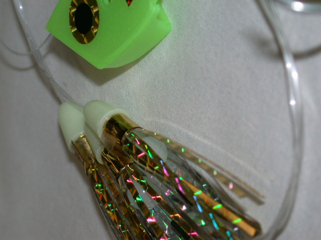 chains, crimps are available in my hardware kit. 4. A simple clinch-knot is the easiest to tie, I use a Trilene knot and moisten 5. Use Cortland's "Bite Guard" Hard Mono to make your meat rigs. This special leader material holds up far better than any regular mono line we tried. 6. The collar Mylar collar, or over-wrap tape adds a finished professional look. Then to keep the collar tape from lifting, use a 1/4' piece of clear (non-frosty) Scotch Tape. This 1/4" specially cut clear tape is available in my hardware kit. 7. This is not rocket surgery, or brain science. A little off here, or there ain't gonna make one iota's difference to the fish! 8. Make sure your skirts are bloused out and separated, especially before you set lines. By not having the Mylar pinched against the leader, this frees up your meat head. 9. There is no wrong way to do this, so don't worry about a inch here, or a 1/4 of an inch there. The fish do not carry a measuring tape. |