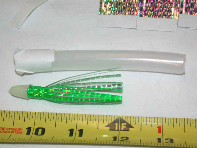 Look closely at this photo. This is a "stock in the package" brand new twinkie fly, it's starting to separate slightly, with some double-faced tape stuck on it. This will not happen if you wrap the collar tape with an overlay of scotch-tape. 10. Overall length is around 2 3/4 inches and this photo features your guide tool for making all your flies the same length. I prefer 3 inches from the tip of the bullet head to the end of the fly, many use 2 1/2 inches too. So, use the length your like. 11. Tape over one of the measuring tool. Trim off at what you want the length of the fly to be ( 2 & 3/4 inches). Please keep in mind this is not rocket science and a little shorter, or a little longer is perfectly is O.K. 12. Trim cutting guide tool to preferred distance. Although you'll have to trim this tubing to size, it will insure a pro job in all flies being uniform. |