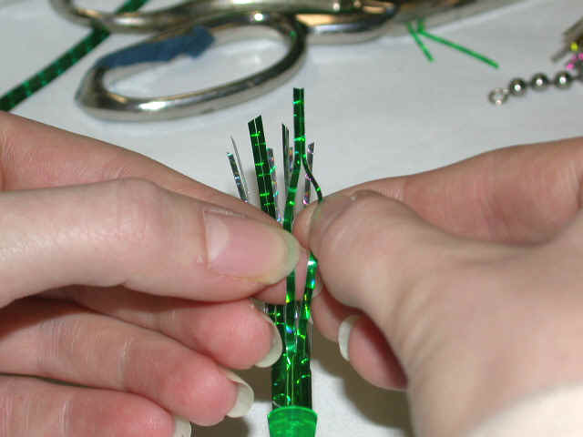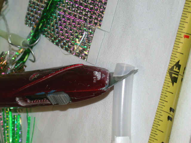 I trim the cutting tool at a 45 degree angle, this is optional. 14. Overall measurement of my cutting tool is 2 & 3/4 inches 15. Trim attractor fly to the correct length 16. Snipped off Mylar fringe tape |