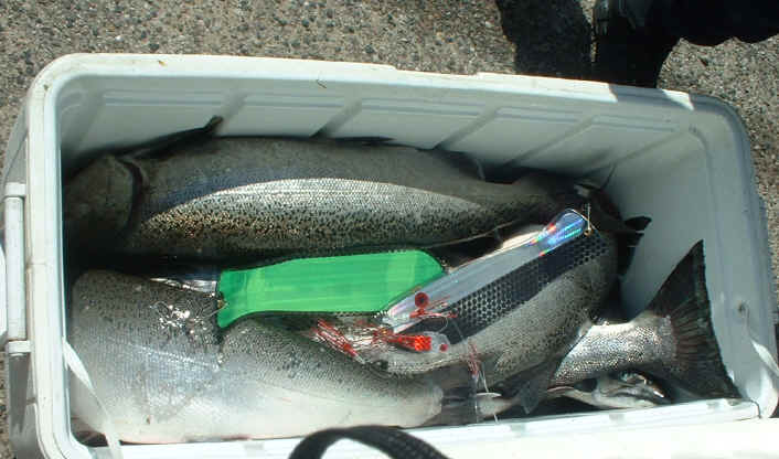 On Saturday morning the seas were rough. 3 to 4 footers that built to 4 to 6 by early afternoon. We went to the first waypoint and found water temps 42 to 45 degrees from 15' to 45' down. Set lines here and in no time started to catch fish. It wasn't long and a pattern was set up over a couple of miles, so we worked this area the rest of the day. We had 15 fish on but only 5 were