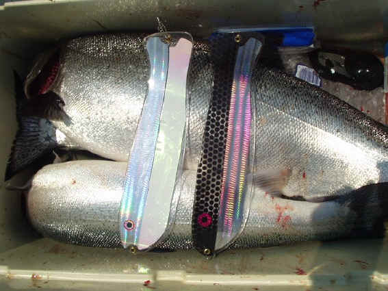 mamba with cut bait shortly after 6:30. From that point on we continued to take fish with several doubles. Most of the boats were outside of us on the bank and we were fishing the shallow side of the drop off. All of our rigs were using Captain John's flashers with cut bait and by 9:00am we had a box full of fish. The last hour we did send down a red flasher wit a squid as the was a few coho showing up in the mix. By 9:00 am we had 11 kings and 2 cohos . Since we had been so busy we mostly forgot about our engine problem and fired it up and no problem. We felt we had a good morning so we pulled lines and were back in port by 9:25.