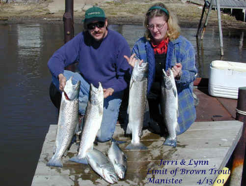 Brown Trout and a Laker we released. 4/7/01 While I had enough sense not to try fishing today, a boat sank off Manistee with 3 very brave lads aboard. All were rescued by the Coast Guard. 4/7/01 Met Ian and Todd Sloan at the boat this morning at 7:30am and was much to windy to even consider fishing the big lake. I'd like to thank Todd for being willing to rebook for a later date. I received a well needed improved fishing report on the Browns in Lake Michigan. The fish had moved onshore yesterday afternoon and the boats that fished in the pm all did decent for the most part....finally!!!!!!!!!!! 4/6/01