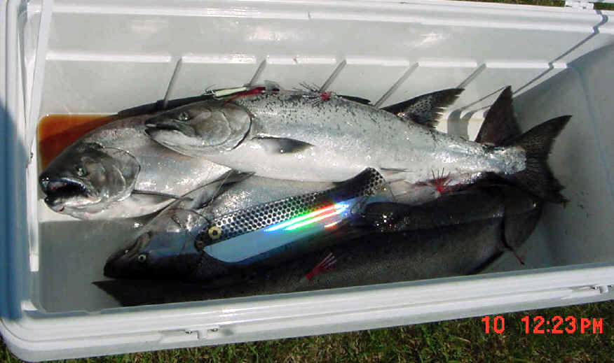 "Hi John, Today's report (7/20/04) is improved from the weekend, good but not excellent. Caught 8 kings and one laker on flies and cut bait with the "Reel Flasher."