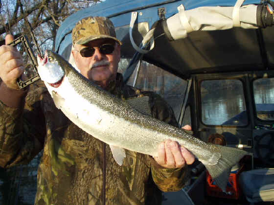 introduced to Lake Michigan and propagated to the rest of the Great Lakes soon after. To verify my data click here to confirm the above dates. 10/21/04 Good news could lay a couple of seasons down the road on the Steelhead scene from what I'm hearing. The diehards that are still pounding the Lk. Michigan off Manistee are being plagued by huge numbers of skipper Steelhead. Skippers are immature fish from 12 to 16 inches long and are about 2 years old. These baby Steelhead are called skippers, because the skip (leap, or jump) all over the surface in an effort to extricate the hook. So, a couple of years down the pike, Steelheading might be on the major improve for the big water and river anglers. 10/20/04 My prediction of success on the Big Manistee river is well formed, because of all the rain we've had. After almost drought conditions in August and September, lots of rain has been the story from Manistee County for about the last week. Rain increases the flow and draws fresh Steelhead in from Lake Michigan. These reel-fresh run fish are dumber then a stump and easy to catch. Unlike spring spawners, fall iron-noggins are super aggressive. These villainous creatures are ready to whack your offering hard. In fact, fall spawn dunkers experience hard hits and can have their rod almost yanked from their paws. This seldom, if ever happens during the spring run. Spring fish as a rule won't go out of their way to hit and need to be bumped in the snout to trigger strikes. Fall Steelheading is a favorite with me!