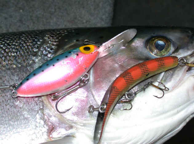 more. 12/12/04 While this info is about a week old, the south end Manistee Lake by the Little Manistee was giving up a mixed catch of Kings, Coho and Steelhead. The lure of choice is the older style of U20 and T4 Flatfish with the spreader bars and 4 nibbler hooks. The best bite has been after 9am thru the early afternoon. This fishery is for the diehard, hardcore fishermen. The weather can be brutal with a stout north wind. Choose you days wisely and this unpublicized and often kept secret fishing hole can produce heart warming catches.. 12/11/04 Finally took some major steps forward with remodeling my office area. Click for progress photo Building a new work station has been a daunting and all too necessary task. Drywall is up, new windows are installed and most of the wiring is complete. Now, that I can see the light at the end of the tunnel, good things for me this week are on the horizon. With black-powder season upon us, some woods time is in order for yours truly. Look for future updates about a recent late season Salmon run and what I consider my ultimate best accomplishment for 2004 was. 12/10/04 Inside word from some of the major harbors on Lake Huron is that the Brown Trout are hitting. For those willing to brave the elements at this time of year, the reward is worth it. Spawn fished on the bottom and casting Cleos seem to be on the Brown Trout's menu. Look for sparse crowds and those in the know not willing to share info about this late season bonanza. I've heard the Browns ranging from 6 to 16 lbs. Now, these are worthy adversaries in anyone's book! 12/9/04 We got hit by a reel-gully washer a couple of days ago. This means great catching opportunities for those who pursue Steelhead on the Big Manistee River. The surge of water will bring up fish from Manistee Lake and Lake Michigan. Look for the upper to mid-sections (my favorite: High Bridge to Bear Creek) to get hot. I know these December Steelhead will be there and I miss not having my jet boat. Steelhead are a wonderfully cooperative specie and will hit in 33 to 70 some degree water. Yep, they're a helluva fish and have my never ending respect! 12/8/04