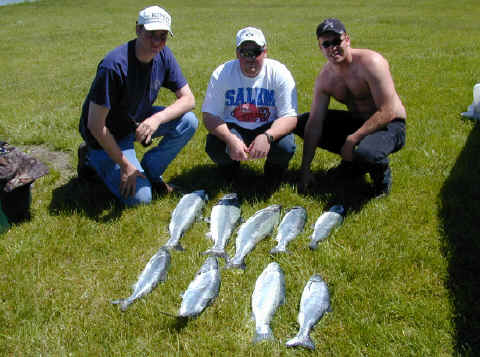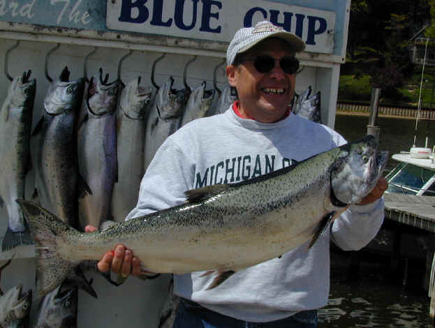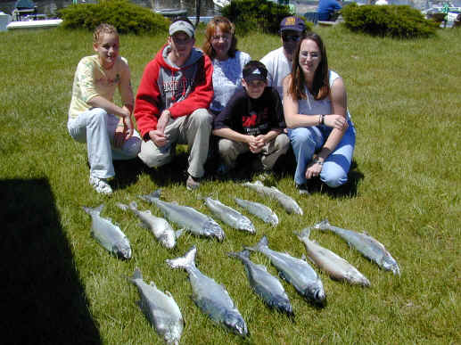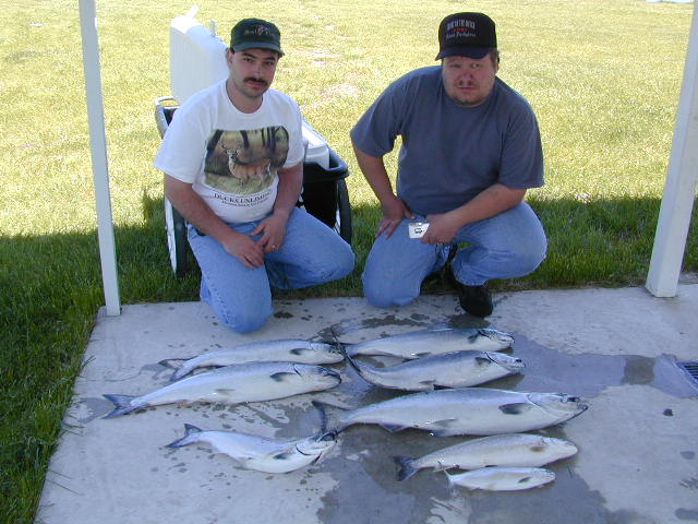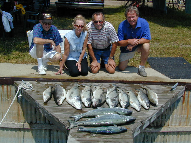 it at all. Tried to find another boat to run the trip and just couldn't. 5/17/01 I'm going to try and finish with the Saugatuck thing this weekend. I should be trailering the boat back Monday. With me being home I'll have time to finish the Bechholds Flasher Deal, Fishlander Spoons, and I'll setting up an account with Luhr Jensen. If you're a member of my E-mail list you'll be entitled to purchased fishing tackle at reduced rates compared to the stores. 5/16/01 I had to cancel the Bill Webb trip for today. Thunderstorms are nothing to mess with, let alone the high winds and heavy rains that accompany them. 5/13/01 8 fish were boated on the 2 Daves charter today after being cancelled out by weather yesterday. Boat Daves are world class folks to fish with. Plus I lost the original story Click here for their catch photo. 5/11/01