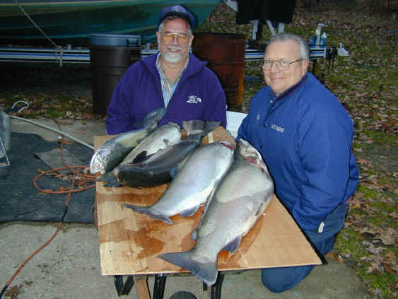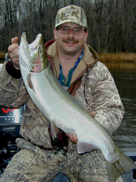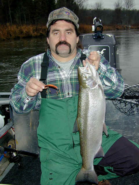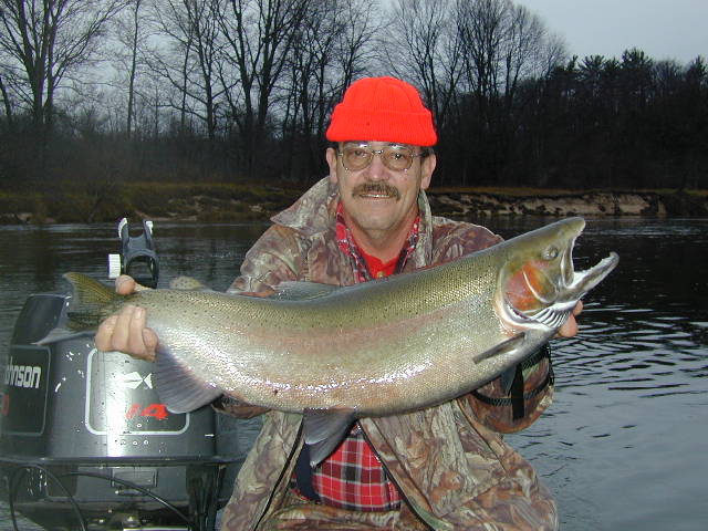 here for Barry and Rich's most excellent mug shots 11/21/01 Getting ready for the annual Thanksgiving fishing with Barry Pines is at the forefront today. Tying up loose ends on the Cherokee winter storage project is what I plan to accomplish. Steelhead fishing in the river should be good. 11/20/01 I've been on a 2 day downstate quest searching tackle outlets for the 4 hook model of the T-4 Flatfish. I found some new colors that should work fine in the Big Manistee River. I'll be returning to Manistee County early tomorrow morning. Angler supreme Barry Pines and friends will be my esteemed guests for the next 3 days of the Thanksgiving weekend. 11/16/01