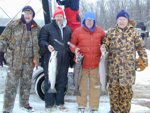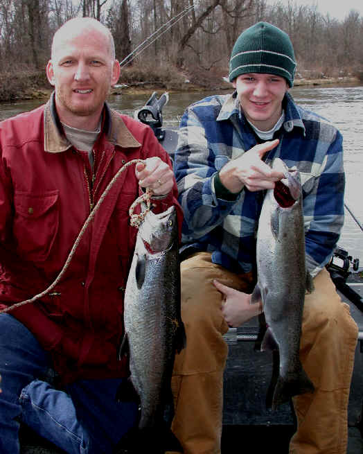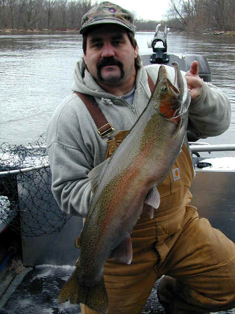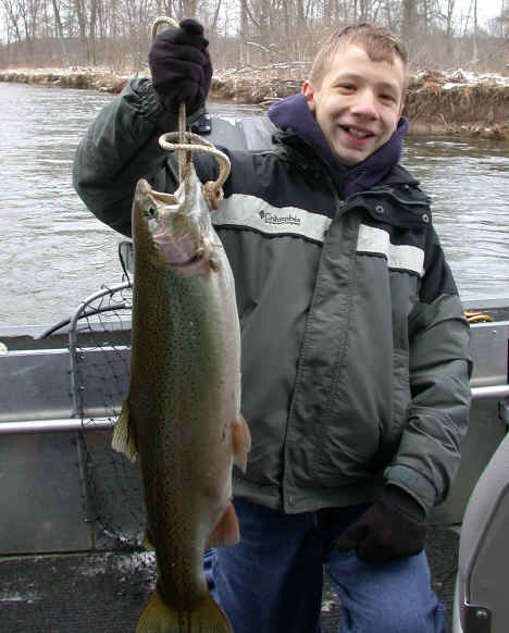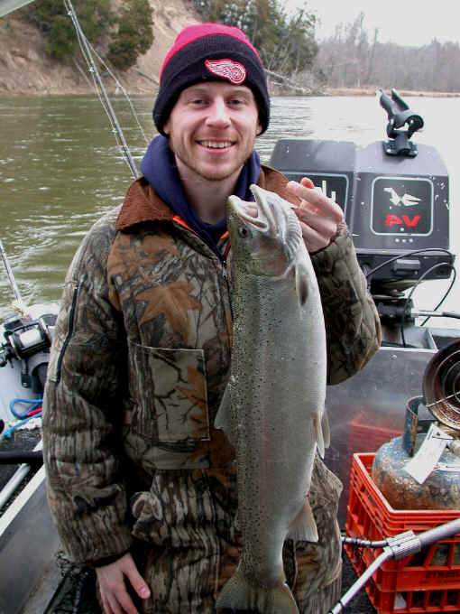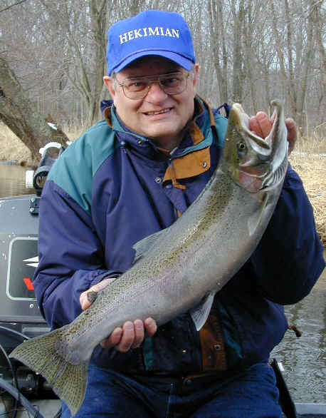 with. 4/4/02 Today was not my day! Although, we had 2 line ripping strikes, neither one stayed hooked up for very long. My guests were Pontiac Fireman, Kelly O'Brien and his 10 year son, Patrick. Kelly was more than nice enough to bring his "famous" pineapple upside down cake, but the Steelhead weren't benevolent to us at all. We fished from about 8am until noon, and slow fishing meant, I wasn't going to push Patrick's patience switch to the limit. Then my brakes let go at the boat ramp, just to make my day even more miserable, not to mention the $$ repair bill. 4/3/02