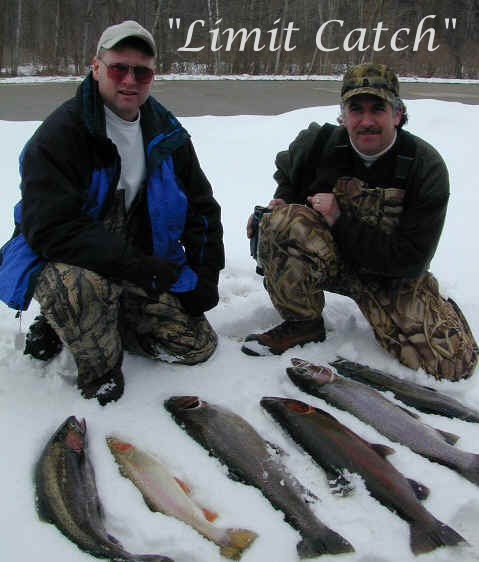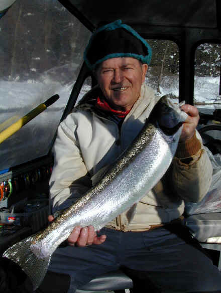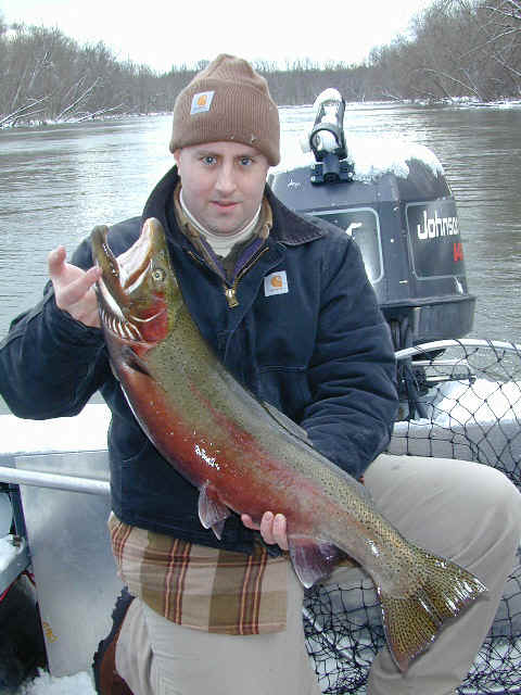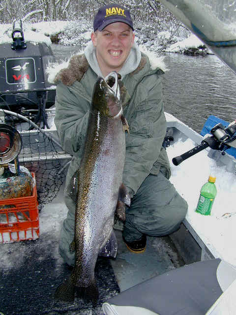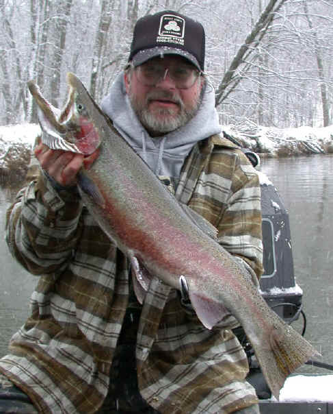 here for Bob's super trophy 3/26/02am I'm fishing today with Bob, the winner of the photo contest who won this trip. We're not gonna start fishing until at least 9am, because of the recent cold spell. While I'm not going the serve any cheese with this whine, I'm at the end of my rope when it comes to this prolonged wintry weather we're experiencing this March. I'm not going get snow blindness, or willing suffer from hypothermia in quest of Steelhead on the Big Manistee River anymore this year. I hope my sentiments echo yours, because this winter stuff has lasted way too long! 3/25/02