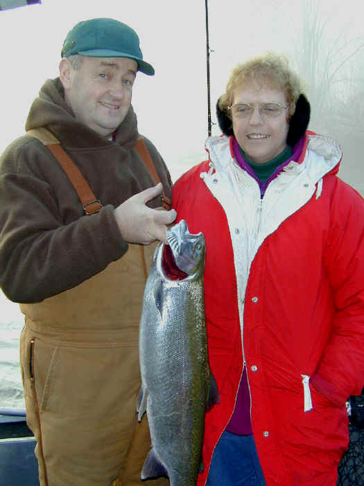 beat up on any one "hole." 11/28/01 Wet, rainy and damp best describes the weather here in Manistee County. Be fishing tomorrow, so look for new pictures and fishing report on Thursday. 11/26/01 Plans for this week include taking Mike from Manistee Auto Electric fishing this Thursday. Dec. 2 and 3 Capt. Len Mitchell from Lucky Charm Charters will be my fishing partner, along with his wife Anita. Reports from the river remain rock-solid. 11/25/01 Fishing for Steelhead in the Big Manistee River is fairly decent, depending on the crowd. As far as I can see, we have more fish available at this time of year, since 1996. To see the reel inside story on the lures I've been using and how to tune them click on: Flatfish Tuning. Fishing should be "Hot" this week with the recent rainfall. Life is good in Manistee County. 11/24/01