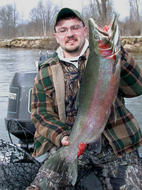 jury rig the flap-gate valve on the jet-pump. 3/25/02am Woke up the Cherokee from it's very long winter's sleep. I took it home from the heated storage building in Wellston I use. I'm on the river everyday this week, so check back later for results. My guest today is Gene Commire and I'm hoping the brutal butt whipping the Steelhead took over the weekend don't completely shut the fish down. We need a few Steelhead to strike.....reel fact! 3/24/02 I went to the zoo at the High Bridge boat launch on the BMR today, at about 3:30pm. There was at least 25 boat trailers with no place to park. The word "heavy traffic" doesn't describe what I saw. Mailed several lure and snubber packs in Manistee also. Let all hope, the winter-like conditions we've been experiencing will break towards spring reel soon! 3/23/02 Catching up on this weeks tackle orders and a trip to the Post Office is in store for me today. My 28 foot Cherokee comes out of it's winter storages long nap. Next weeks weather in Manistee County looks much better that what we've experienced this week. They're calling for temps approaching 50 by next Saturday. 3/22/02
