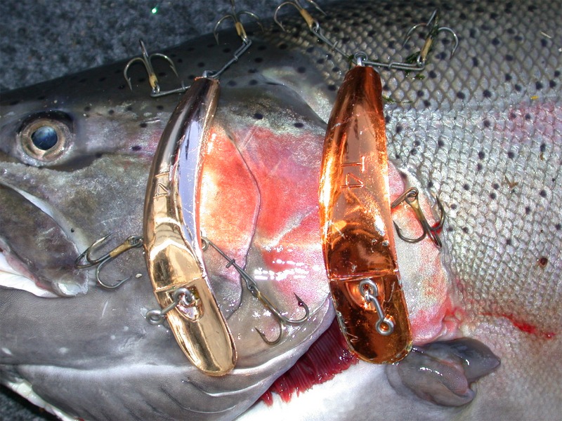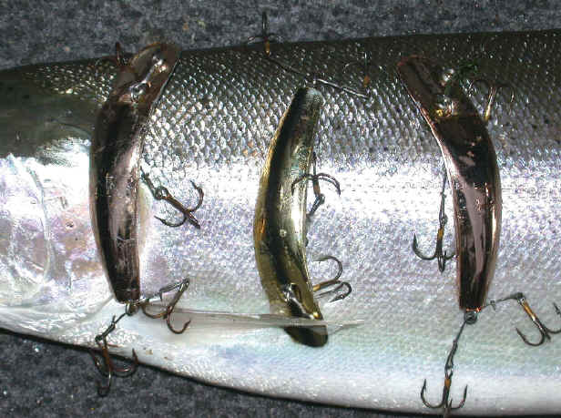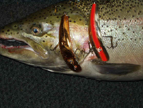 Steelhead strikes, 6 hooked-up and 4 made it to the net. One chewed us off and we released 2 of the 4 fish we did boat. One of the rancorous males John caught rocketed at least 4 feet out of the drink! We averaged about one bite an hour, so the action was decent, but not "red hot." 11/17/03 Gonna be back on the Big Manistee River again today with Warren Knapp and John Johnson. Both of these men have crewed for me on the big lake, with John J. doing most of the duty lately. This is my small way of showing appreciation for the work they have done. I'll betcha you'd like your boss to take you Steelheading on the big river for an employee appreciation day! Check back later this evening to see how we did, and a fresh update. The recent fish and hot lures pictures is exactly what the doctor ordered to brighten-up this website.