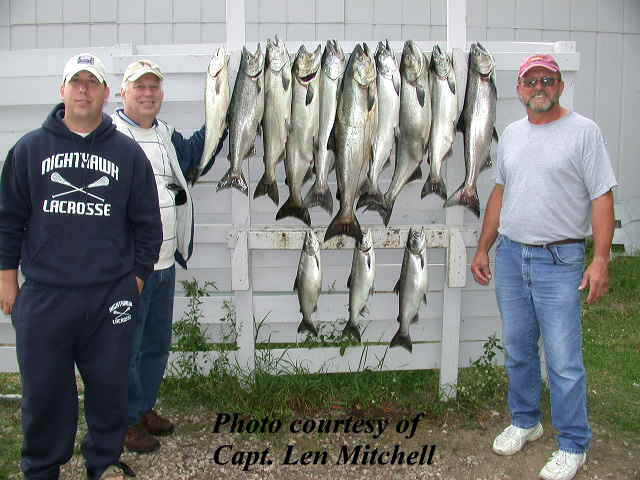 ....we went with only set 6 rods. Four with meat and two boards with spoons. The two dipsey rods were 70' and 80' back on 3 and the riggers were 28' and 35' down. We were seeing the temp break at 25 feet down. It went from 66 on the surface to 48 only 30 feet down.