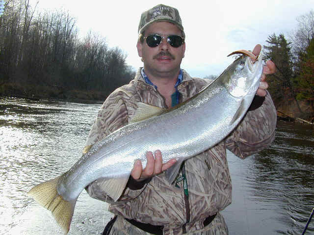 10/31/05  Just haven't heard that much good from the Big Manistee this fall.  Generally, when fishermen are doing well, the news travels quickly.  Mid-October did get a lower river push of fresh run silver bullets, but as of lately mum is the word.  Fall Steelhead are an ornery critter to deal with under the best of circumstances, let alone in a river infested with log jams.  Click for a fall silver bullet