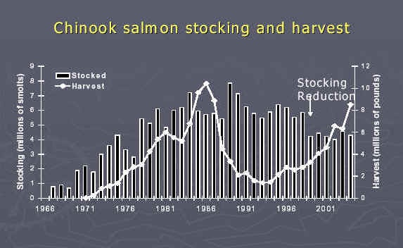 Cutting the plant 25% will do little to lower the surplus of Kings in my opinion.  Kings are now approaching 40 generations in the Great Lakes. It's my belief our  Salmon have evolved/adapted and are naturally reproducing in far larger numbers no one has taken into consideration.  5 fish limit on Kings should be implemented in 2006!