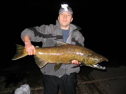 Nocturnal Ted and Stefan hit the Manistee River last Saturday night.  They took 4 Kings and missed several more.  They fished way downriver from Tippy Dam.  All their strikes came in fast water on the gravel. Click for an almost spawned out King