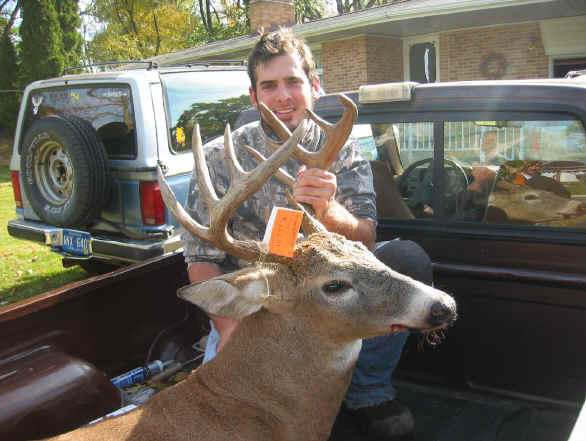 10/7/05  Finally cooler weather has hit the north country.  Those who were bow hunting in the July-like weather had a problem once they did take a deer.  Heat and a dead carcass mean a quick trip to the deer processors, or spoiled meat.  Today's featured photo is 8 point from Lapeer County's farm country. Steve Burns took this animal last weekend, packed the cavity with ice and made haste to the butcher shop.