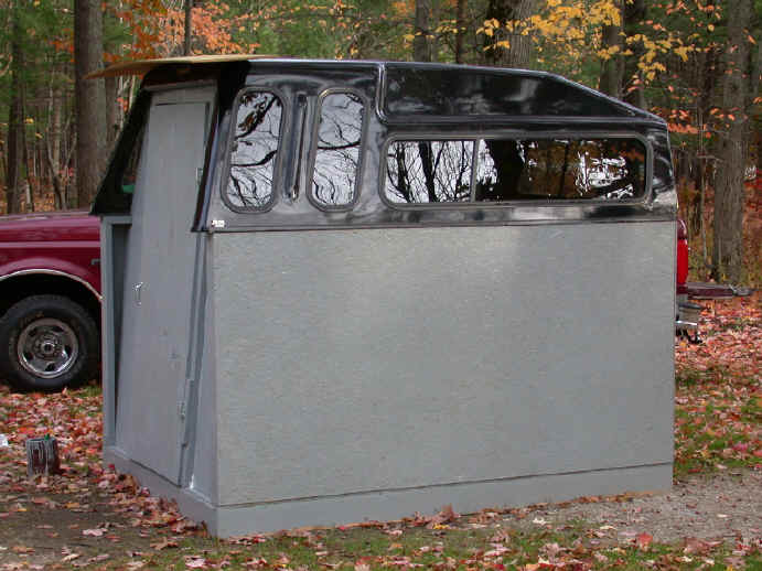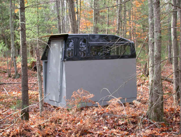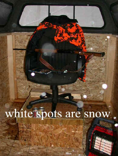 11/2/05  Yesterday's deer photos gave added incentive to hang the door on my new deer blind.  Being made in sections, today I'll truck the blind into the woods and reassemble behind my place.  The idea to use an old pickup topper came last black powder season during a early spell of nippy weather. Click for deer blind