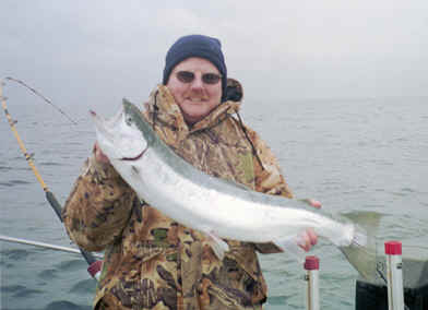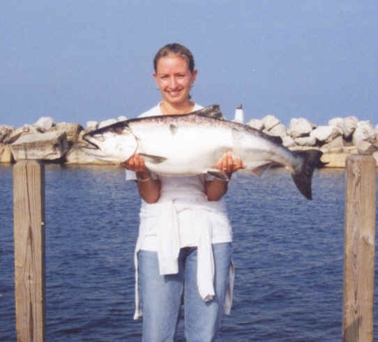 Our first photo shows Kirk's daughter Kindey, with a King bracketed in the 30 pound range, from just a few seasons back.  If this big tuna was caught during 2005, it probably would have taken all the big fish contests between Ludington & Frankfort.  Kindey is does a great job landing big fish.  It's often said, natural skill was passed down to her from her teacher and loving dad (Kirk). Click for Kindey's super whopper