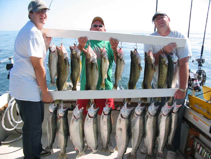10/6/05  The great combo catch of Walleyes and Steelhead came from Erie, PA.  Capt. Pete from www.dearmsteelie.com  reported spoons were the flavor of the day and full and core and a half (15 colors of lead core) were some of the weapons.  Best depths 53 to 68 feet down over 85 feet of water.  I'm impressed with the chunky girth of the obviously well fed Steelhead.  Lake Erie has long been known as the Walleye Capital of the World and now it looks like it might be the Steelhead Capital as well.  I chartered on Lake Erie from 1984 thru 1989 and took a few incidental Iron Noggins each season, but nothing like they're doing nowadays.
