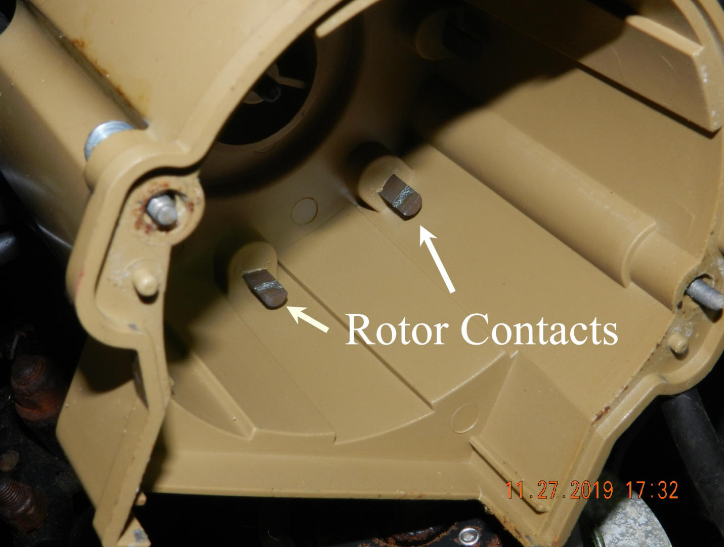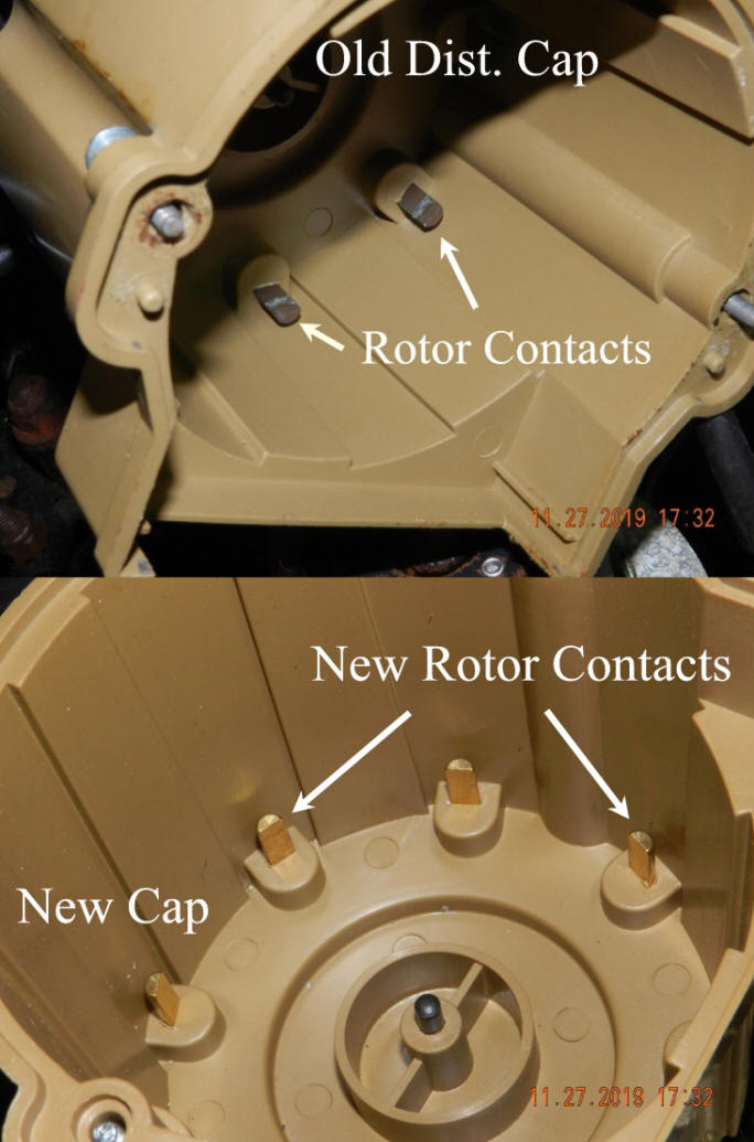 12/5/19  Posted a photo of an old vs. new distributor cap.  Old cap is still decent and the motor ran fine.  Not much wear from electrical arc buildup.  Old cap can be put right by lightly scraping the contact terminals.  I opted for new and know I'll get 2-3 years of service from a new cap and rotor.  Click old vs. new dist. cap