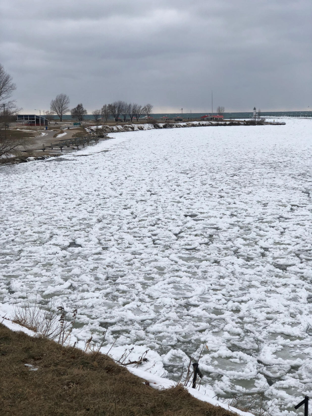 1/7/20  Mentioned the lack of anything close to safe ice on inland lakes around my place for the hard-water fishermen.  Open water on Lk. MI is a good thing that let's light penetrate to keep the food chain moving.  Lk. Huron lost their alewife population after it froze over for 2 consecutive years.  So, to we need Lk. MI to stay ice free.