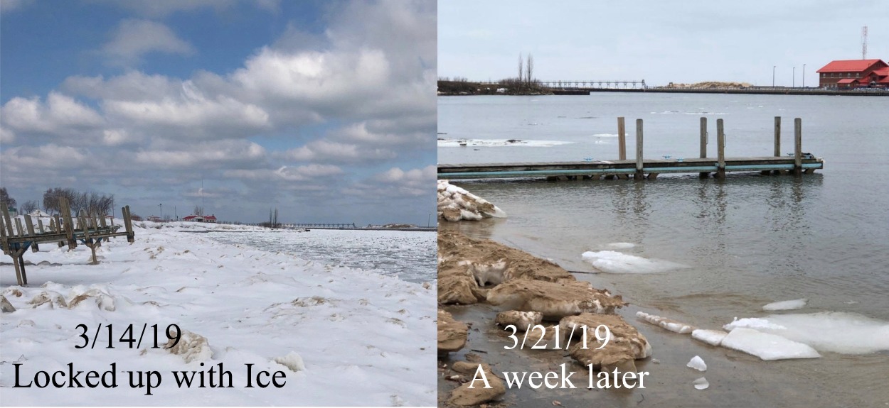 Have no doubt there would have been a few boats out this coming Sunday with the predicted high temps around 50°.  However, Sunday seas are predicted to be from the S at 25 knots with waves 4' to 7'.  This stout breeze will break up/melt any remaining ice.