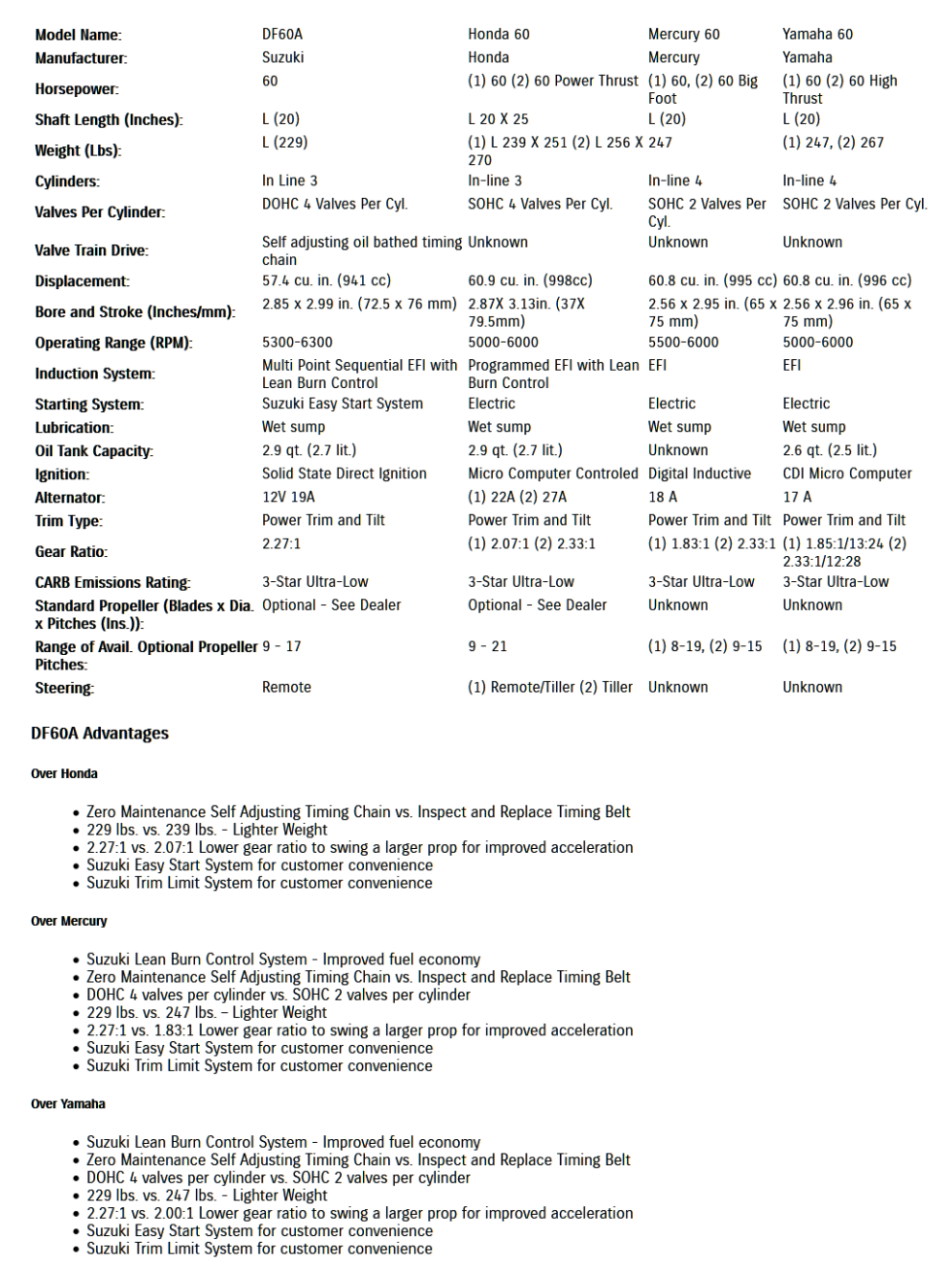 Weight is 229 lbs. vs. 197 lbs. on the 40 hp 2 stroke Evinrude it's replacing.  This swap is a lot closer to even when you figure the Evinrude 1.8 gallon 2 cycle oil tank full of oil is pushing close to 20 lbs.  Click for stat sheet comparison