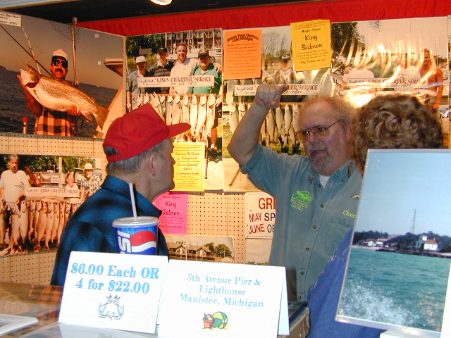 Got lucky with this photo when friends, Chuck Cartwright, aka Mr. Silver Streak was visiting with Capt. Bud Raskey at my booth.  Bud has his back to the camera with the red hat.  We were at Flint Steelheaders Show in March of 2001. Click for this photo