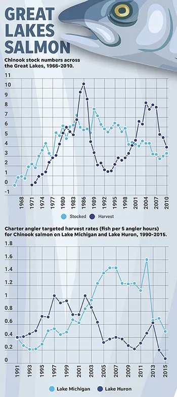 Same time frame Lk. Huron's King/Chinook Salmon catch went up.  In 1989 moved my summer charters to Port Austin, MI and did see a rebound in repeat customers.  Fishing off the tip of Michigan's thumb was top notch.  EZ limits of LTs when needed, but enough Kings to keep charter customers happy with mixed bag and big numbers.