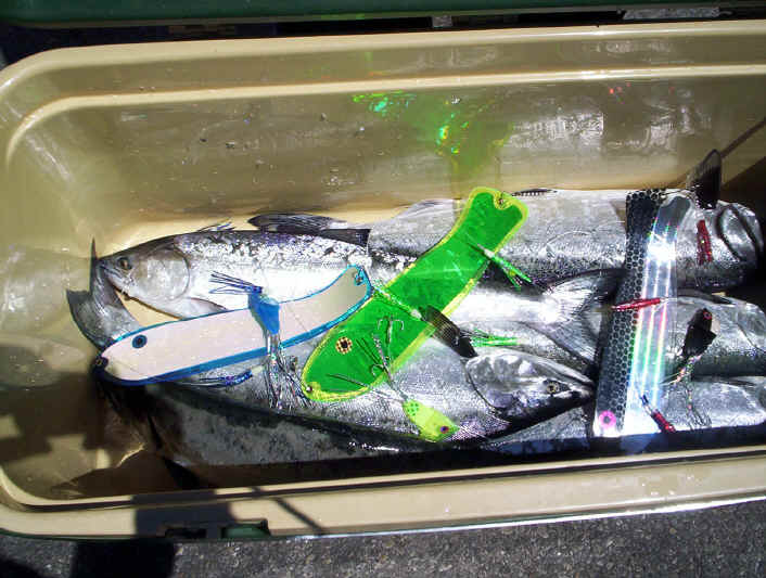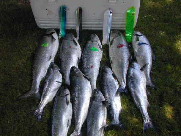 4 mph with the sweet spot being 2.5 to 2.7 mph. Cut-bait has had the largest impact, starting in 2003 at 17% share, then climbing to 24% in 2004. 2006 cut-bait swelled to 40%, which in itself is a phenomenal gain. Let's attribute this fact to: it's by far, ...the easiest to use. Sight, sound and scent as the herring is does the all the work. The meat program will also take larger fish and this factoid was evidenced in the August 2005 Frankfort GLPAA tournament. Where on day 1, five of the top ten vessels were all pulling my flashers, Super Magnum Meat Heads and herring. As things ended up on day 2, four of the top 10 teams had my stuff in the water and picked up a check. I won't get too long in the lip about the tackle I offer, but this I say with 1000% confidence. There is not bait head holder on the market presently that will out perform mine and offer the Salmon angler the wide variety of options the my meat head in Magnum and Super Magnum do! Click for Capt. John's meat heads There is one major heavy-duty draw back to using meat instead of the more traditional artificial lures. That being your box will be a lot harder to lift off the boat and you're gonna spend a ton more time at the cleaning table. Note: most of the above text was written in 2005 and might not reflect current trends that change and vary from year to year. Computers have many uses, storing data like in the above many seasons of polls is an excellent example! Some of the advantages to a meat program 1. The stuff works all