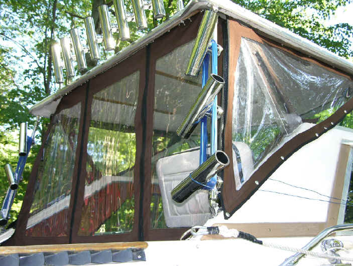 9/13/07  Had a new backdrop made with new side curtains.  Having an enclosed cabin ranks high on my list to stay comfortable.  Keeping the wind off is 90% of the battle of being warm.  This new enclosure will make early and late season fishing far more enjoyable.