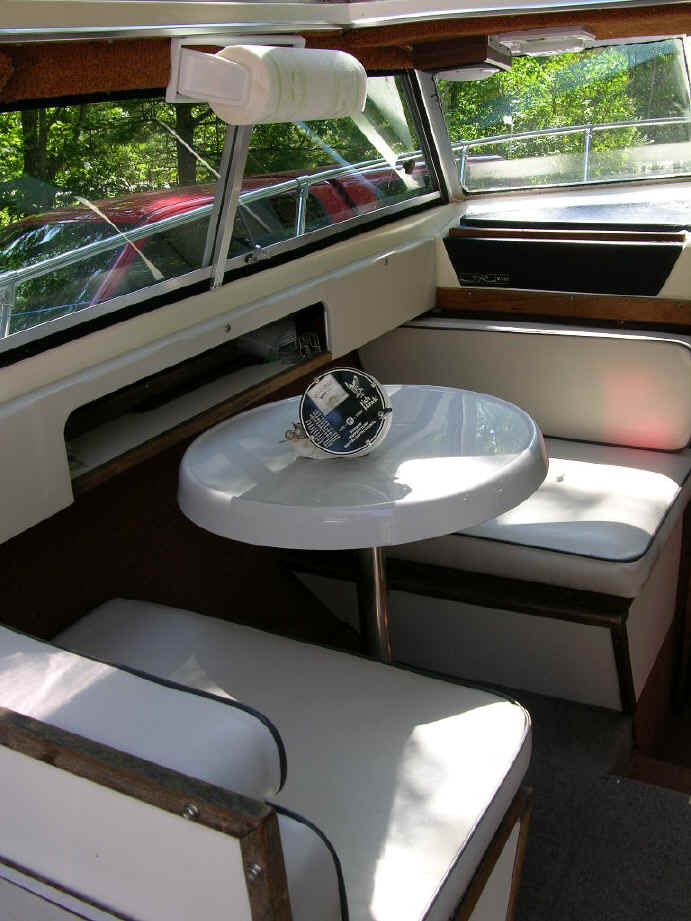 Adding in all together, this is a good 100 pound weight shift to counteract the 15 hp. 4 stroke kicker.  Installed the new dinette table/cushions for a new dressy look.  This vessel had no tunes, a CD player with a 4 speaker system is now in.  Mounted a safety push-pull switch to control 12 DC fused panel for the electronics/CD player.  This boat is now ultra ready and something I can be proud up.  There's only two things left for this project being: radar and a good reliable autopilot to be added this fall when the floor is redone!