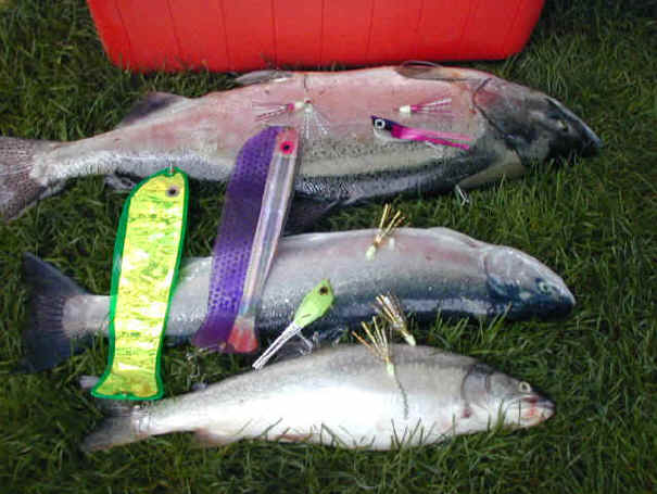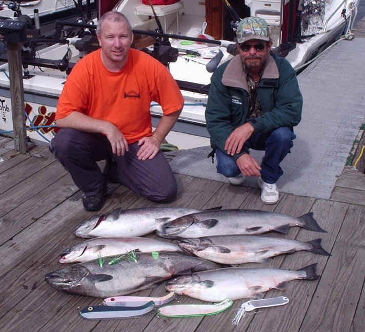 We left with a smile on our faces and a bag full of goodies. As is our luck, the wind began to blow terribly. When it was finally safe to go out, we fought Mother Nature and put our bag of goodies to the test. WOW! There were times when we couldn't keep Black Mamba and the "Secret One" in the water. We have pulled spoons, dodgers and squid, dodgers and flies, hoochies and J-plugs over the years, but this Reel Flasher/meat program out fishes any other method. We listened as other boats lamented on the radio that they weren't having much success. We were having a blast! It's a good feeling to go to the cleaning station and have more nice quality fish than anyone else.