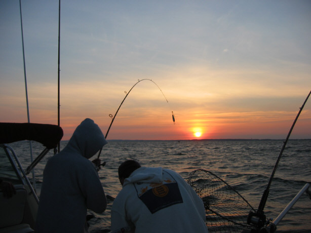 I found some 43 degree water way away from the flotilla to the north and was the only boat in the area. For five minutes I had three poles in the water. The rest of the hour I had only one that didn't have a fish on it. Also I heard that there is a net in the 19's. I cannot confirm or deny this, but it is worth noting.