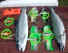 "This was my first outing with your products on board, some pics from this morning, 17 salmon landed, 5...3 to 10 pounders, 12 between 12 and 26 pounds. 14 taken on your flashers. We ran a 4 rod spread with 2 of us on the boat, we fished from 6:30 to 9:30 am, also missed 6 other fish. Loved the green flasher in the pic, it accounted for the most action, could not keep it in the water, NO $HIT!!! We came in cause our arms were sore." Tom