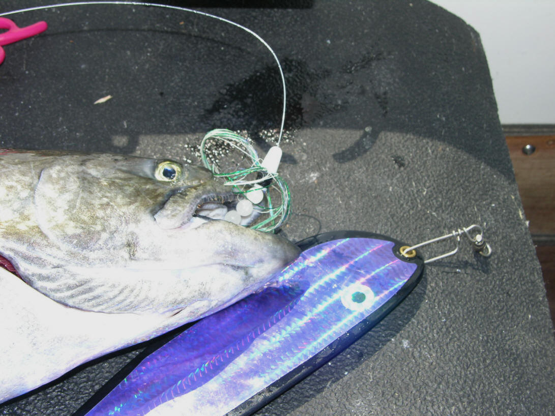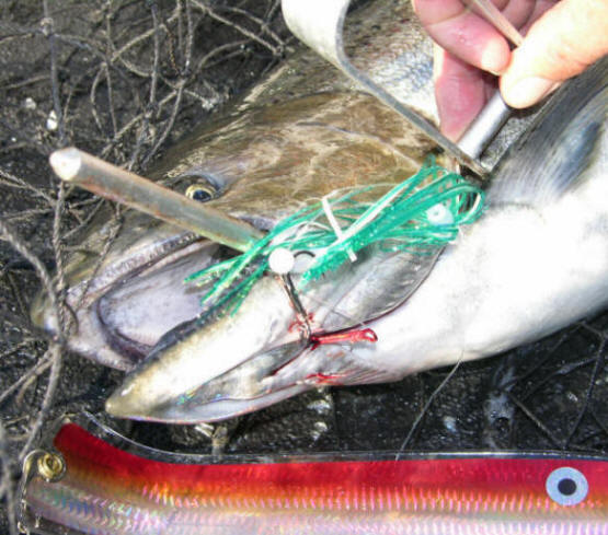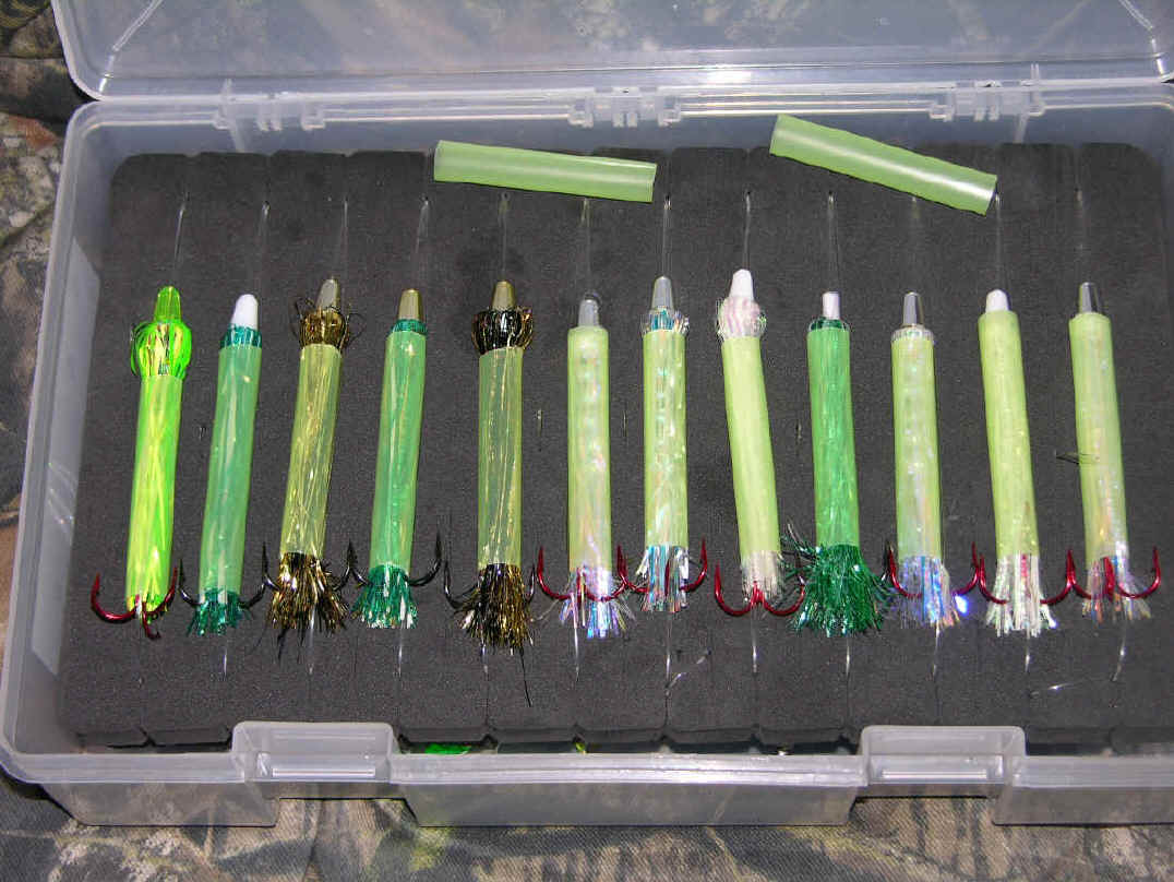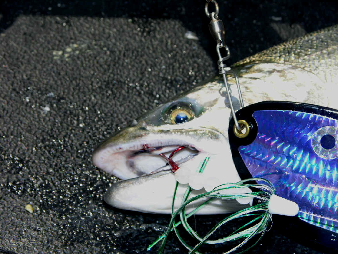 Double Your Pleasure, Double Your Fun! Missing hits on flies is now is a thing of past since we changed over to double snelled trebles. On 8/31/08 we boated let's say ...one fish out of 4 diver bites. 9/2/08 we wised up and changed over to all double snelled trebles on our flies, same as on our meat rigs. We didn't miss any hits on our divers hits that day, or the 3 diver whacks on 9/25/08. Not hooking up hits on our trolling flies is now ancient history since we went to all double snelled trebles on our trolling flies.