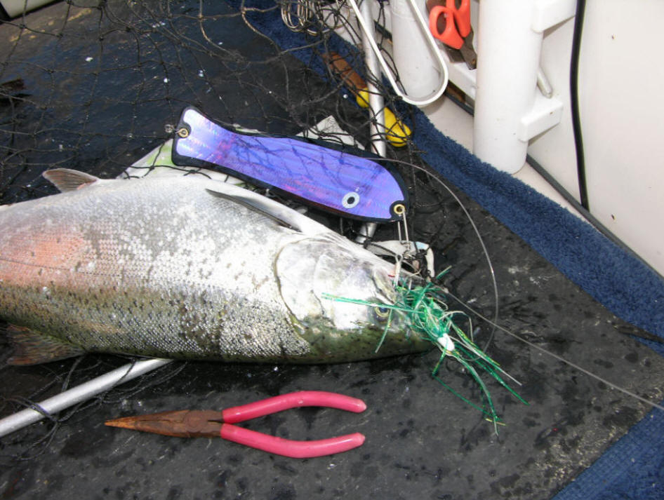 Looking Prisoners Instead of Escapees? The majority of the reference material for this article was collected on 9/2/08 out of the Port of Manistee, MI. We fished the hours of 9am thru 2:30pm (lines in the water). This was a revenge trip from 8/31/08 where we missed approximately half our hits on flies and BTI 10" Flashers. This was our first effort with all trolling flies equipped exclusively with snelled tandem VMC treble hooks. We had 11 bites and capitalized on 10 of these opportunities. We used a dual meat and fly program. Are best action came over 160' to 180' on 9/2/08. Meat Deep The deepest part of our 3 rigger program and 2 diver spread was towing meat in the 80' to 125' depths. Water temp at 80' down was 52 degrees. Then falling off gradually to 38 degrees at 125'. All fish that bit on the 80' to 125' riggers ...in the cooler waters fully engulfed the flasher/meat rigs. Taking the bait way down their throats and the hooks were deeply embedded on the inside of these deep fishes chops. Fly High After taking several photos it became 100% clear every fish boated on our divers, fished in the higher part of the water column pulling flasher-fly combos were all hooked under the fishes snout. Not one BTI flasher/fly combo caught adult Salmon on 9/2/08 ever fully committed to opening their jaws. If the flasher/artificial trolling fly caught fish were hungry hard-hitting eaters? ...we'd have been taken photos unhooking the fish with hooks buried down deep inside their chops. This was not the case, as the images on this page plainly show! The intriguing part is the snout/chin hooked fish up higher in the water column in the 70 to 58 degree water. While it was possible to pry hits out of these warmer adult Salmon, these fish were not willing to attack as to swallow the offering. Conclusion These photos proves there's two