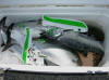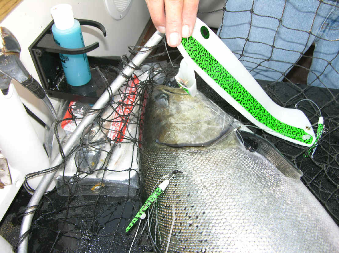 Snippets 1. Extra sharp hooks, pay attention to this important part of your weaponry. Off peak bite will afford opportunities at the rate of 2 maybe 3 bites an hour if you're over fish. Learn to turn hits into boxed fish with focusing on details. 2. Mid day fish will generally be deeper cold water fish in temps from 44 to 38 degree and semi lethargic. Meaning your adversary will not run down a meal that looks to hard to eat. Slow troll from 1.5 to 2 mph will aid in tantalizing your target species. 3. Mid day is when the wind picks up. It's easier to do a long downwind troll with the waves at your stern. If you've located a good 2 mile piece of water it's a lot quicker to pick up lines and travel to the original point of beginning. Getting speed right will be a heck of a lot trouble-free to duplicate rather than trying to fight a head sea. Plus, a bunch more comfortable for you and your crew. 4. Set a goal, or a point to travel to in an effort to cover water. Some of this is for exploration purposes to sort out the fish holding water and depths before retracing unproductive routes. Avoid doing the same thing twice, double true if it's not working. Look at it like I do, if all I'm doing is making mistakes, let's make a brand new. Meaning a new tact, one not influenced by recent past performance issues. 5. Less stress is involved, cuz you're not going to be playing dodge boats that will dictate your trolling path. Lead core and copper? This is the time for this long distance program from the boat. Not when there's a ton of boats waiting to saw you off. 6. Do not crowd a lot of riggers all in the same approximate depth. We try to maintain a 15' depth separation on our 3 rigger spread. Mid day fish cruising for a meal can be turned off by too much stuff. Then stagger the leads with the deepest rigger have the shortest lead from the cannon ball and gradually increase the distance on the rigger that are higher. Our center rigger is the always the deepest with a 10 to 15' lead, next higher will have a 20 to 25' lead and our highest rigger will be back 30 to 40'. What's just been mentioned works if you concentrating on depths from 80 to 120 down. If you have to go deeper, tighten the all leads up more to like 10 to 12 feet if you're working the 150' to 200' depths. These deep Capt. Nemo fish taint all that fussy. 7. Use north/south