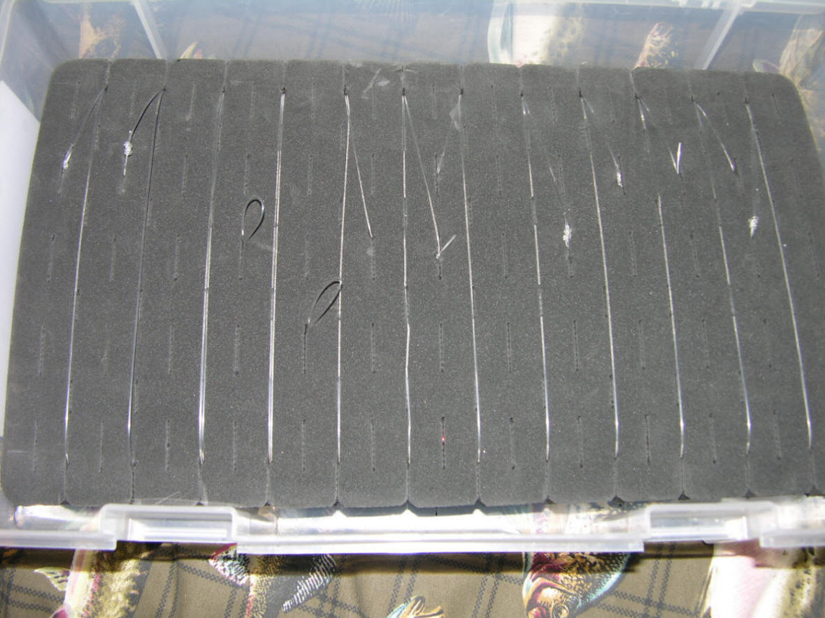 Loading Meat Rigs Load the foam inserts as pictured. Then, place the bottom inserts face down and the top inserts goes face up. This no hooks are touching and either foam insert/leader holder can be accessed easily. Keeping in mind all hooks must be loaded in the normal face up position and on the same side as the meat heads. Just press the hooks into the foam at a slight angle, then it's a straight wrap to tame the leader on the meat rig. Take your time loading and the rewards will far exceed what I charge at the webstore for this awesome storage solution.
