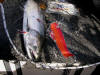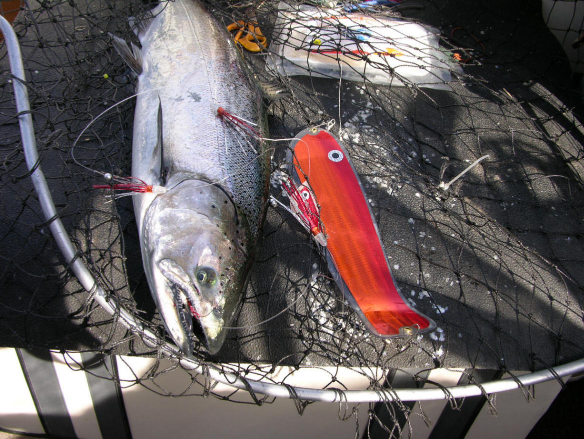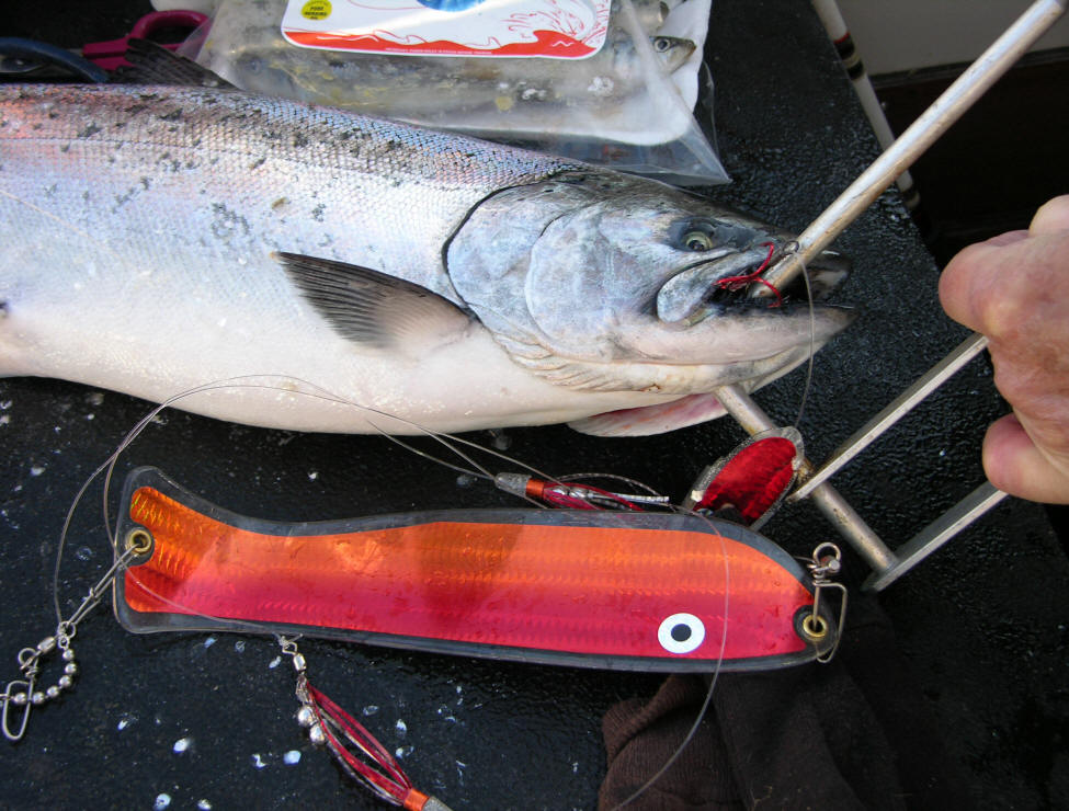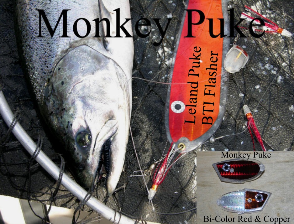 Breaking white light into who know what down at a 100'. Lest not forget microwaves that fall in between IR and radio waves. None of this stuff amounts to a hill of beans surrounding the reel-facts about Great Lakes fish actually seeing red. For all we know fish vision can be superior ours and quite possibly see into the infrared and UV bands of the spectrum. Are you of the mindset that thinks scientific principles can be applied to the unsolvable eternal mystery of fishing? Please let me remind you of the infinite amount of variables that rarely, if ever can be duplicated. Snippets 1. Not a fleet-wide accepted color, red works in your favor. 2. Ex-spurt is a leaky faucet that got fixed. 3. What does red look like to a fish? Who cares just as long as they bite on it. 4. It's long been proven Steelhead, or 'bows prefer fluorescent reds. 5. Fluorescent Red is a long proven Coho killer. 6. Adult male Great Lakes Coho develop deep red sides. 7. Red is used by nature several ways, like drawing mates. 8. Misinformation is spread by those with blatant disregard for common sense and reel-facts. 9. Red is one of the most expensive pigments for paint and same goes for colorants used in plastic injection molding. Maybe the red disappears controversy was a possible preemptive strike to keep production costs low? 10. I've got a fresh crisp 100 dollar bill awaiting anyone who can prove beyond a shadow of doubt, fish cannot see red. Why? ...cuz, there's over 20 photos in both parts of this article that say otherwise. Showing undisputable photographic proven evidence of red jaw jewlery. Click for part 1 & 2010 Leland Puke BTI Flasher Info Looking to purchase tackle that works? Then click here!