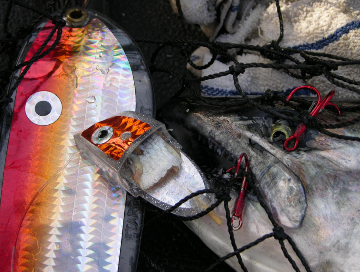 has. I know this is going to be hard to believe, but on my last trip of the season (10/1/09) every bite came off the hot new Monkey Puke meat rig. The conditions were plain lousy for good fishing on 10/1/09 with flat calm tabletop water. Slick flat water does not usually facilitate good action. Reason? We can only guess. Suspecting light is not broken up by the waves and it over-illuminates the baits/lures? The end product of maxed-out light penetration might aid hungry aggressive fish making it too easy to grab a mouthful of baitfish. Anyways, getting back to the 10/1/09 trip we fished