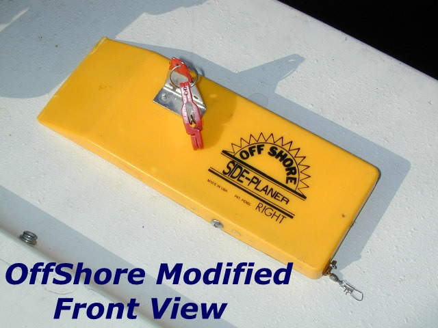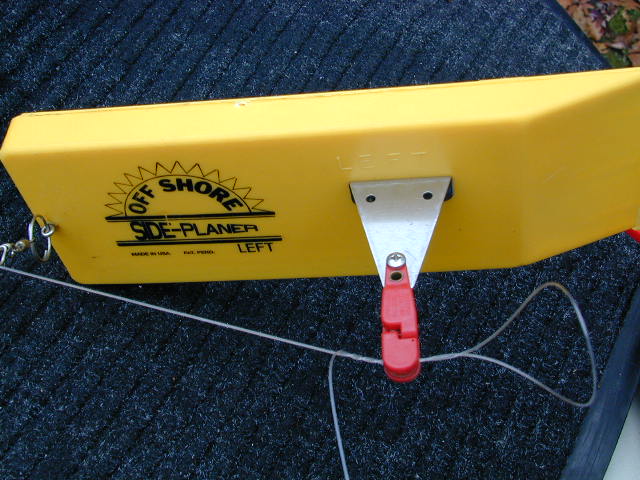 better. In-Line Planers or Regular Planer Boards? Why choose the in-lines over the standard dual planer board? Because the in-lines offers advantages like the surging or jigging action the little boards impart to the lure. Next, they'll run in rougher water the standard board which can flip over and cause you a world of grief when it turns into a deep six and heads for the bottom. When a fish rips into the in-line planer it's a better hook set because you're directly straight lined immediately to the fish, plus the constant drag of the in-line planer the hook will stay in a fish better too, especially on the skyrocketing Steelhead that won't stay in the water. I've used the Yellow Birds, Willie Boards and the Roach Board and they all will work fine, however, I've had my best luck with the Off Shore Side Planer that features tremendous rough water stability. But, they'll need the modifications below to attain pro-caliber results. Modifications (1.) The stationary Mini Release needs to be changed to one that moves on a split ring. This will assist in the hooking and mainly the board won't drag near so hard when you're pulling them in. I've used the large split rings that come with the stock board. The newer version of the board comes with a plastic arm and the older ones used metal with a tab of metal the hold the release outright. Tip: if they're the metal arm, just break off the tiny upright tab of metal and insert the split ring in the exposed hole. (2.) The rear tow point needs to be moved from in the middle of it's side to the lowest point on the rear of the board and in the middle. This can be done with just a pair of pliers but it's better to drill pilot hole. (3.) Trim off 1 inch of lead on the front of the flat bar of lead (the keel). This will allow the board to ride higher in the front and impart more of a skipping or jigging action to the lure. (4.)