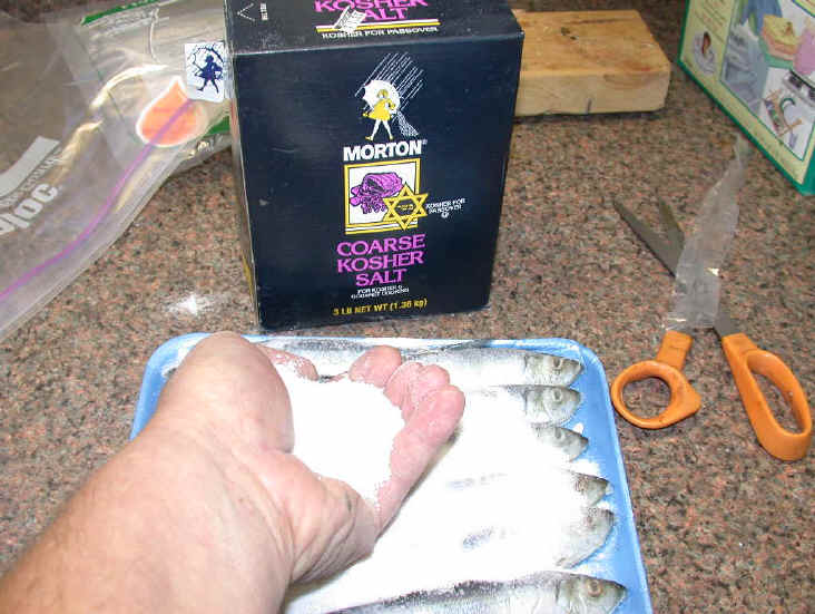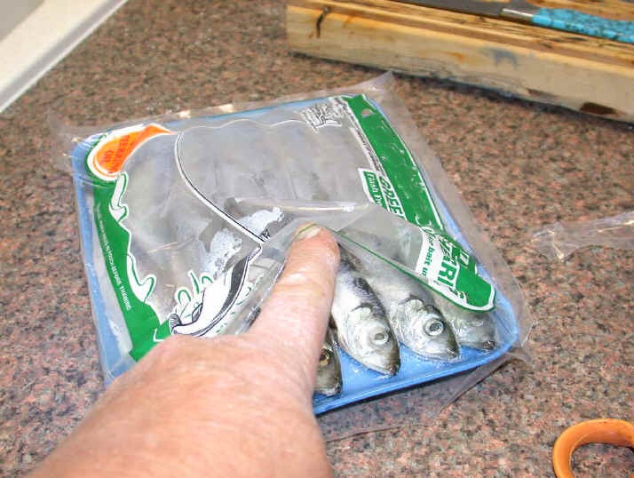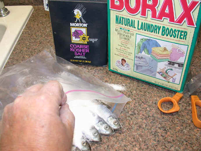 Photo 5. This it the simple deal of letting the bait thaw for about an 1/2 hour. I don't let it set out too long as not to dry the tail fins out, which will become a huge asset in my book. Please take note of the faint white lines on the bait, that's the still frozen herring oil. Photo 6. Sprinkle the herring liberally with a goodly handful of 20 Mule Team Borax which helps set the scales. The scales is where the color, or shine is held. You don't want to lose any more scales then necessary. Photo 7. After the bait is covered with 20 Mule Team Borax, a matching handful of Kosher, or pickling salt is added. This is not rocket science, so handfuls work for me. If you feel it's a necessity to measure the ingredients it's a 1/2 cup of Borax and a 1/2 of the Kosher salt. Photo 8. Then I put the whole deal in a gallon Zip-Lock bag. Use only the high quality Zip-Locks, the extra pennies is worth then worth it. 5/26/09 Update: I no longer use a zip lock and found a pickle jar offers better protection. With less chance of leakage. This article was first penned in 2004 and need to update the storage method we're using now. |