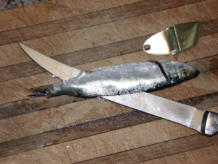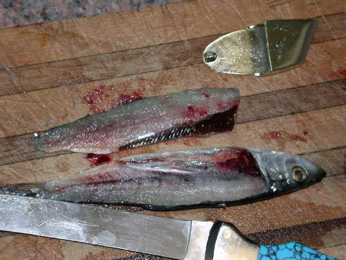 Photo 9. This is the easy part where I add about 16 ounces of water. Like I said, it's not rocket science. I let the thawing process continue in the Zip-Lock for about a hour. Keeping in mind, the scales are also being set even more tightly. Photo 10. Before total thaw has occurred, I start the filleting. I like the herring to be firm and not 100% thawed. I think this helps in making a better fillet in the long run. I've done it when the herring are thawed too, but personal preference is slightly frozen. Photo 11. This is the kinda tricky part, because you have to figure out which side your going to leave the tail fins attached to. I call this the "A" side. The "A" side perfectly matches the bait head holder then. What I mean by matching is the fillet is right side up to the bait head and looks to some extent a little more natural. The "B" side still works, but won't have the tail flipper. Photo 12. This is the angle of the blade, before I turn the knife and slice down thru the herring towards the tail. This angled cut is made directly behind the gills. Tip: You must have a sharp knife to accomplish this task. Remember to use the whole blade, by drawing the blade down and thru the herring, do not to drag the knife. Use the full length of the blade in a smooth effortless cutting motion.