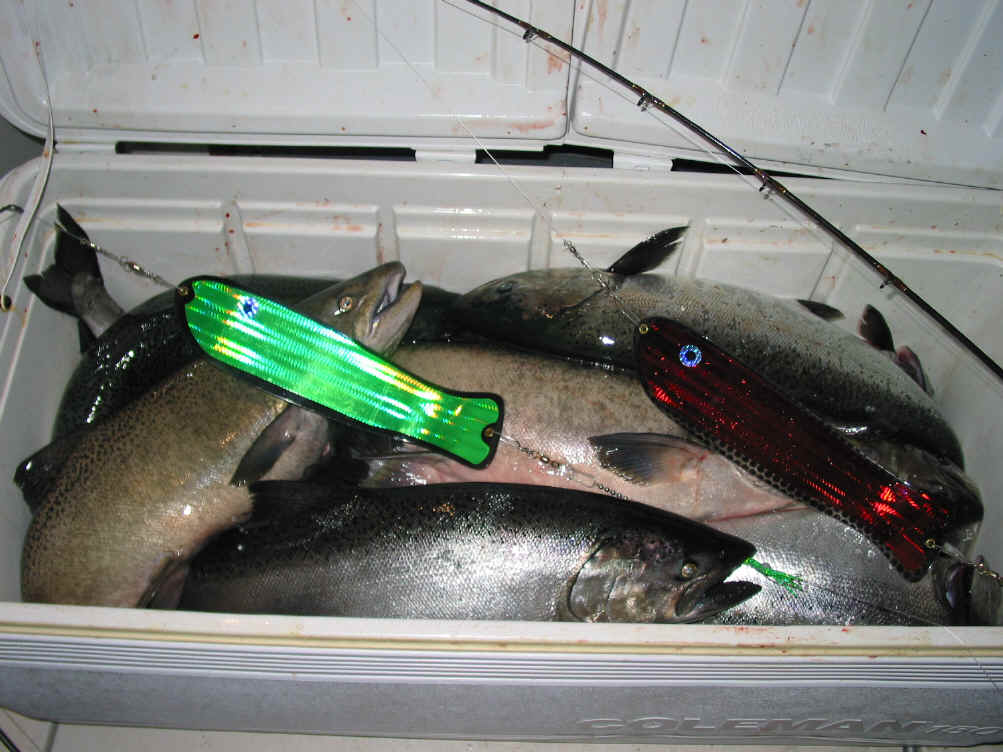 is good? I know my stuff is good before I put it in the water and have 100% confidence in it. 9. Fish your own program and ignore the BS on the radio, many people can't be out-lied 21. Never doubt yourself, or your program. You can not put fish under your boat. We all make wrong calls and being lucky all the time just ain't gonna work. Reel-Flashers and meat work if there's any fish in your neighborhood. If not, pack up and move to another area pronto, or file that info away so you don't make that same mistake again. Now, like everything with fishing there are exceptions, so if the fish are deep at depths exceeding a 100 feet you might not get a early bite, but at 9am all hell breaks loose. 22. Never relegate one or two rods to meat, if you do?.....you're destined not to gain confidence in this method. Load the spread and go for it! The more scent in the water the better. Once you see the effectiveness of this style of catching, I doubt you'll ever look back. 23. Never be to inflexible to learn new ways to catch fish. Being stubborn will do more harm then good. Those with the least experience seem to do best with my product and the meat program. Those who have never taken big catches of Kings have found by using my product, what was once hard,.......is now comes easy. Click here for further proof 24. If your results have been lackluster into the land of fishing with cut-bait, please try following the directions I provided here and I'll bet the story will have a different ending. With meat fishing your results depend on the quality of the cut-bait you have in the water. |