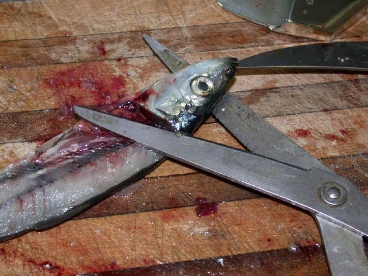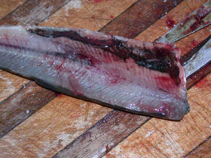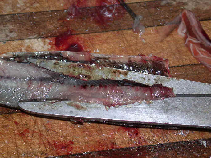 Photo 13. Now, things might get a tad tricky. You need to use scissors now to snip off the head. This is the "A" side we're working on. The "B" side will just be a strip with no tail fin. Photo 14. There's only about of a 5/16s" of an inch of room inside the bait head. By trimming, the bait will easily slide into the bait head holder without looking scruffy. Photo 15. This image shows the snipped off area and how thick (from top to bottom) the herring is. It's my firm belief the backbone being left in assists in a more natural life-like spin, as it stiffens up the fillet. Also, you can see it's far to wide to fit into the bait head holder. Photo 16. You now need to trim off the belly, so the top to bottom measurement is 1 1/16" of an inch. Be sure to trim any tiny rib bones hanging down from the herring's rib cage. |