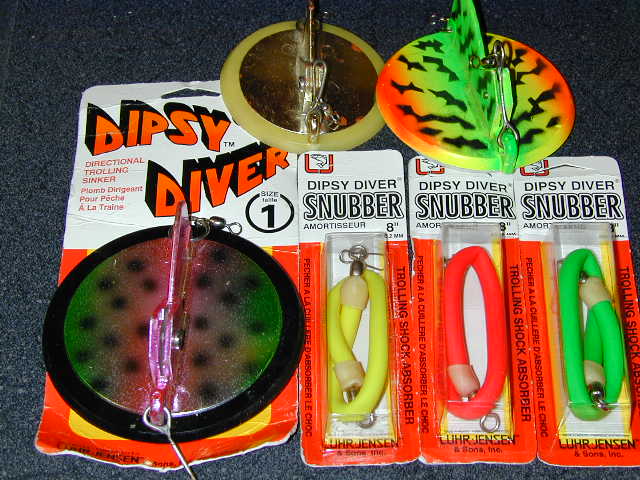 Basics Let's start with the principles of how divers work and what a tremendous tool they've become in Salmon fishing. First of all, a diver is a mechanism that attains depth by water pressure forcing it down. You can fish divers to 100 feet plus and it's often been referred to as the 'poor man's downrigger'. The modern day divers, like the Slide Diver and the Dipsy Diver, will also dive out and away from the boat, depending on how much line you let out. This happens because of their saucer shape along with a adjustable lead keel (in most cases). Once you've mastered the simple techniques when using these remarkable pieces of plastic, you'll soon come to rely on them, ...as much as I do. Why are divers so highly effective? Because in most cases they fish out and away from the boat, increasing your trolling path by 100 feet or more. As I've said many times, the big lake trolling fishery is like a farmer plowing a field and, in simple terms, a 4 bottom plow is more efficient that a 2 bottom plow. Also, they cover areas in a stealthy, silent mode out where those spooky fish are going to go to avoid boat noise/pressure. Diver History on the Great lakes The first diving apparatus I used in 1969 was called a Pink Lady. This "Hot Setup" was a heavy duty industrial grade diver that was supposed to be able to be tripped and reset by a hard jerk of the rod. What was supposed to happen and what actually did were two different things! The tripping mechanism on the Pink Lady was a joke and you were faced with a long hard tow back to the boat. Of course in the 60's the standard Salmon rod had the action of a stout broomstick equipped with a roller tip and after lots of hard pulling you'd eventually be able to retrieve it. Personally I didn't care about the poor design. I cared about the fact that they caught fish and everybody had Salmon Fever back then, so we didn't seem to mind the extra work. Dipsys Dipsy Divers were a product manufactured by Luhr Jensen and Sons in Hood River Oregon. Luhr Jensen sold their company to Normark, the Rapala folks who, in turn promptly moved Dipsy production to China. The Dipsys are probably the most widely used divers on Lake Michigan and will dive straight down and out to the side of your trolling pattern, depending on what number you dial it on. It comes in 4 sizes with rings that are added for extra depth. These things do catch fish and by mastering the Dipsys you'll be adding many more fish to your yearly catch. Divers are widely effected by line diameter and type of line used (mono, Spectra or wire). This is going to be a hard one for me to explain exactly where the divers are fishing. This is a seat of the pants feel you'll have to develop on your own, but I do have some basic guidelines that can be applied. There is a well defined science to using diving planers and I've yet to master it myself after over 30 years of trying, but I'll try to explain to you what I've learned. Most importantly, short leaders behind the divers have never really produced well for me. What I mean is leaders 6 feet or shorter. If I'm using a 10 foot rod, a 10 foot leader is required for best results. A snubber is a necessity when using the non-stretch Spectra type fishing lines (i.e. Spider Wire, Gorilla Braid and Rip Cord). The snubbers can be purchased anyplace selling the Dipsys (see above photo). Dipsys come in many colors but I don't have a color preference most of the time. Here's a worthwhile tip: take an older beat up Dipsy and paint it flat black with spray paint. When the fish are reel choosy in the middle of the day, that one that will probably go. If you stretch the snubber out, you can paint that when spraying the diver. Snubbers, or Shock Absorbers Snubbers