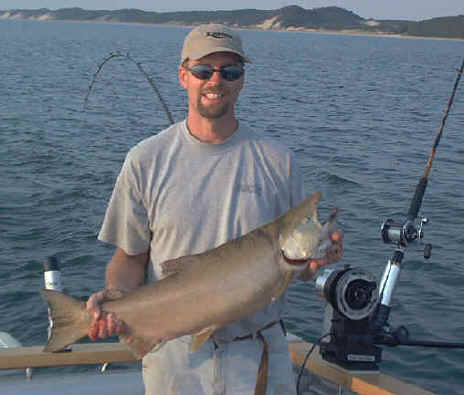 Once out we tend to set up in the river or river mouth lake. In the morning, you cannot do this too early. I took a day off this year and got out an hour before the sun would think about sliding up over the dunes, and had a king rip the line off the first rigger release I set before I could lower the ball. I was glad it was not in my fingers at the time. Setting up on the way out gets the rods ready to go before you encounter the kings, and you can always drop them to the proper depths as you work out. Charge up all glow lures with a flash or spotlight before shipping them down and any time you have them back into the boat.